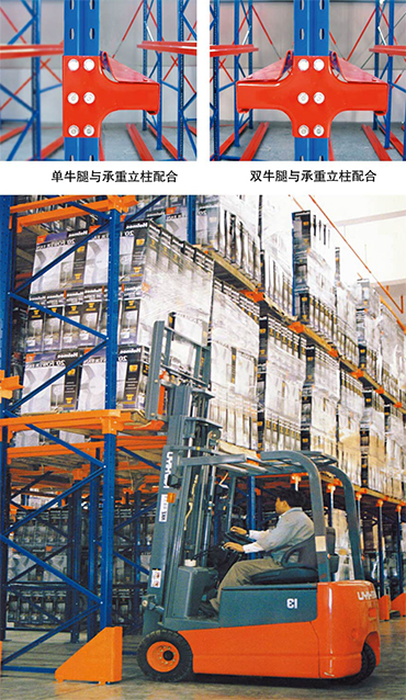 駛入式貨架的設計原理是把數排傳統式貨架連接起來,沒有專用的走道,其配置方式可以為兩組駛入式貨架背對背安裝,或者單一組靠墻,叉車的進出皆使用相同的走道。存放時先由內部存放,再依序向外存放,而出貨時先由外部貨物取出,再向內依序取貨。存儲密度非常好,但不能先進先出。適合周期性批量作業及存取物料頻率高的原料倉庫或運轉倉庫。 ![]()