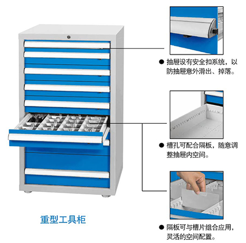 抽屜及箱體均使用優質冷乳鋼板,經l磷酸鹽處理后,外加粉體烤漆,以達防銹效果; 箱體結構堅固,四周鑲有滑軌固定溝槽,以便彈性調整變換之用。底部附有調整腳微調,避免柜體晃動現象; 旋開式連桿鎖裝置,一經上鎖即全部鎖住。可選用鎖王系統; 抽屜四周鑲有槽孔,并可配合槽隔板、橫隔板作彈性間隔, 且設有安全裝置系統,未經人為操作,抽屜不會滑出掉落。