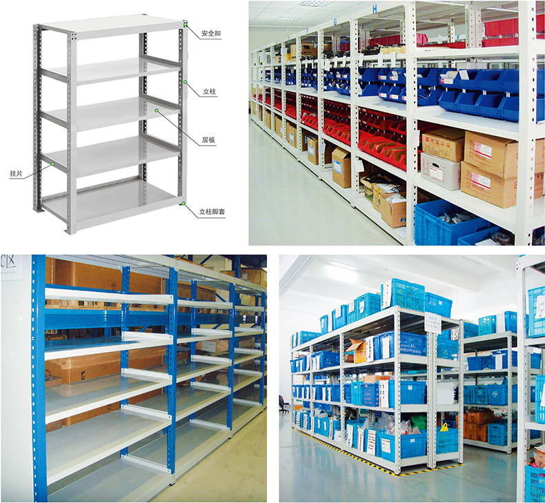 主要由立柱、橫梁、托架和層板組成,主要特點為無螺栓連接,組裝、拆卸簡便(僅需要橡皮錘就可以進行組裝/拆卸),外形美觀大 方,適用于人工存取貨物情況,承載能力通常為200~350KG/層,可以滿足大部分使用要求。層板為冷板鈑金而成,可以按50mm步距自由上下調整,為便于操作人員存取貨物,貨架可單獨使用,也可自由拼接成各種排列方式。 ![]()
